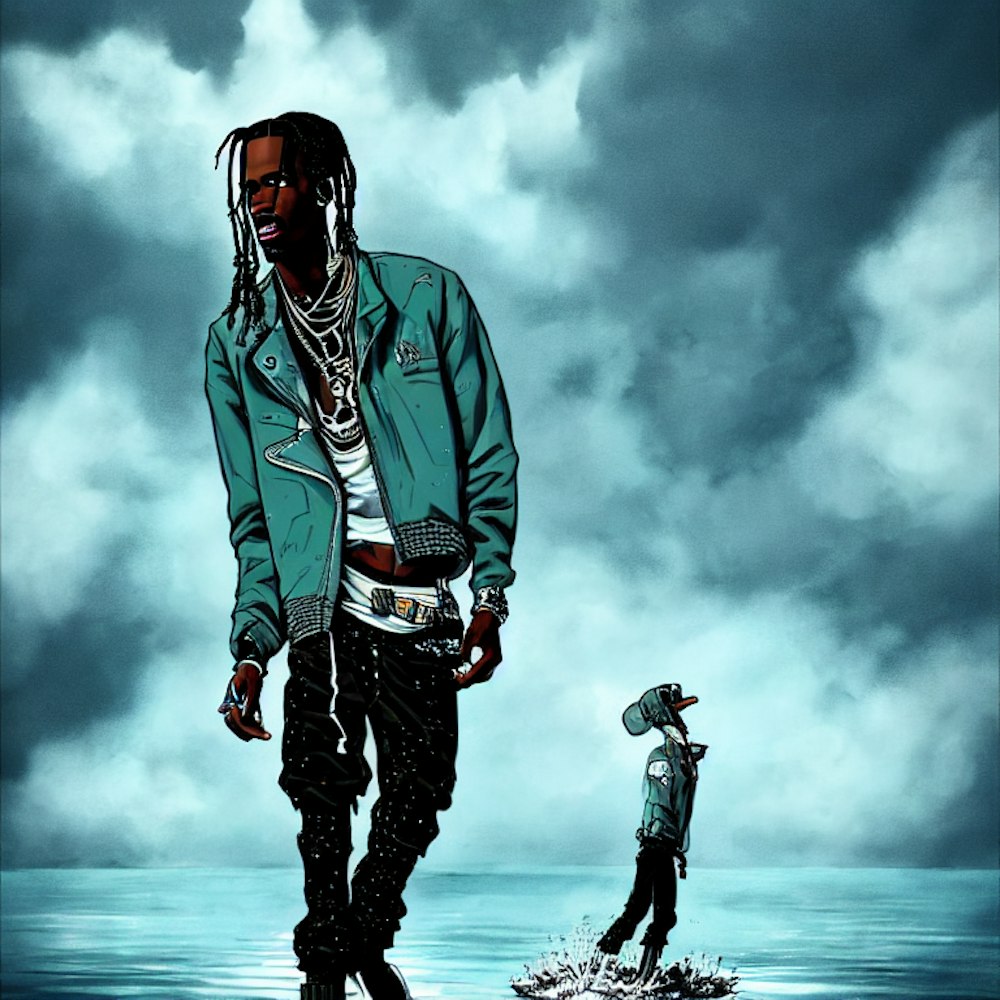 cartoon version of the music artist Travis Scott standing with a jacket on water