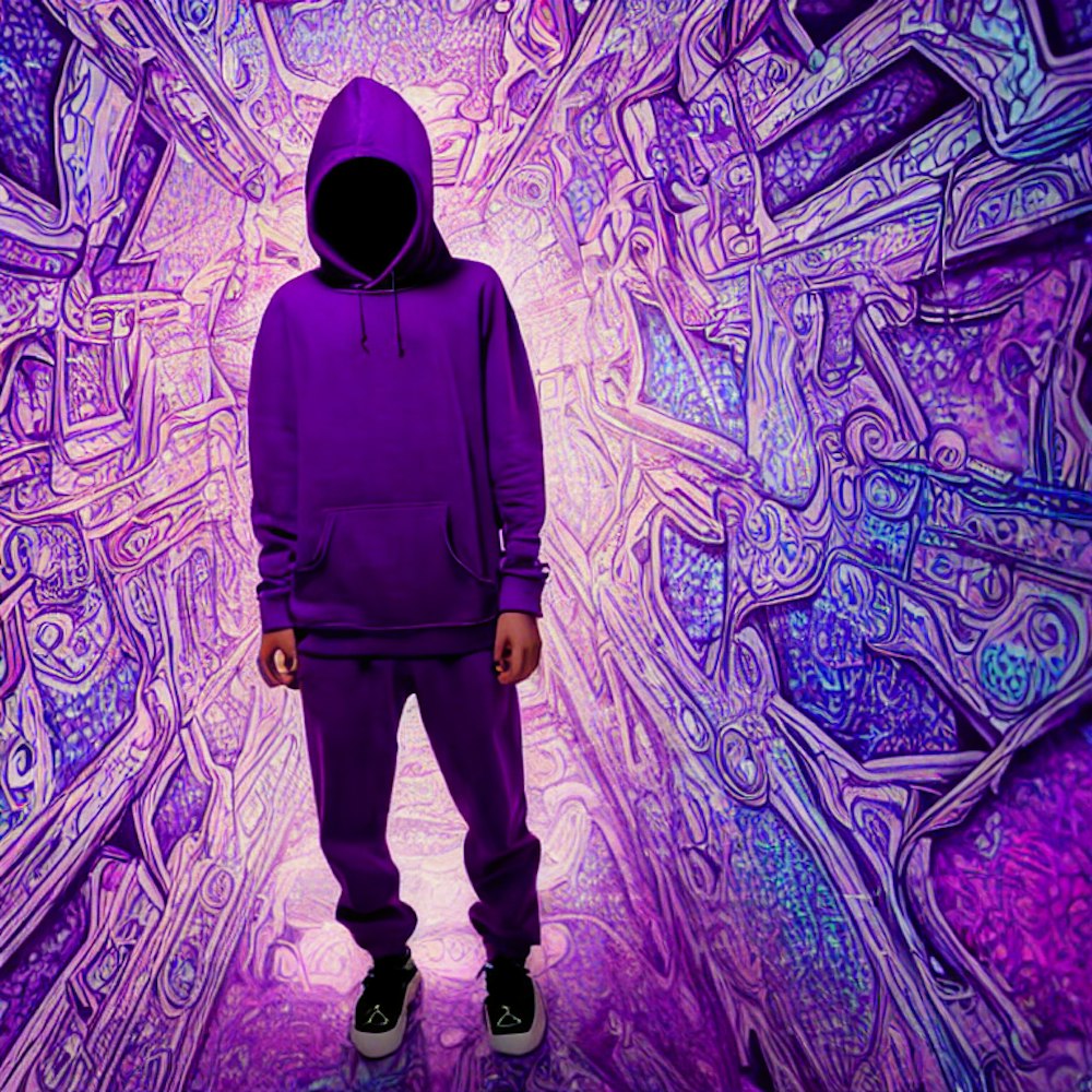 Trippy Hoodie boy no face in big purple room