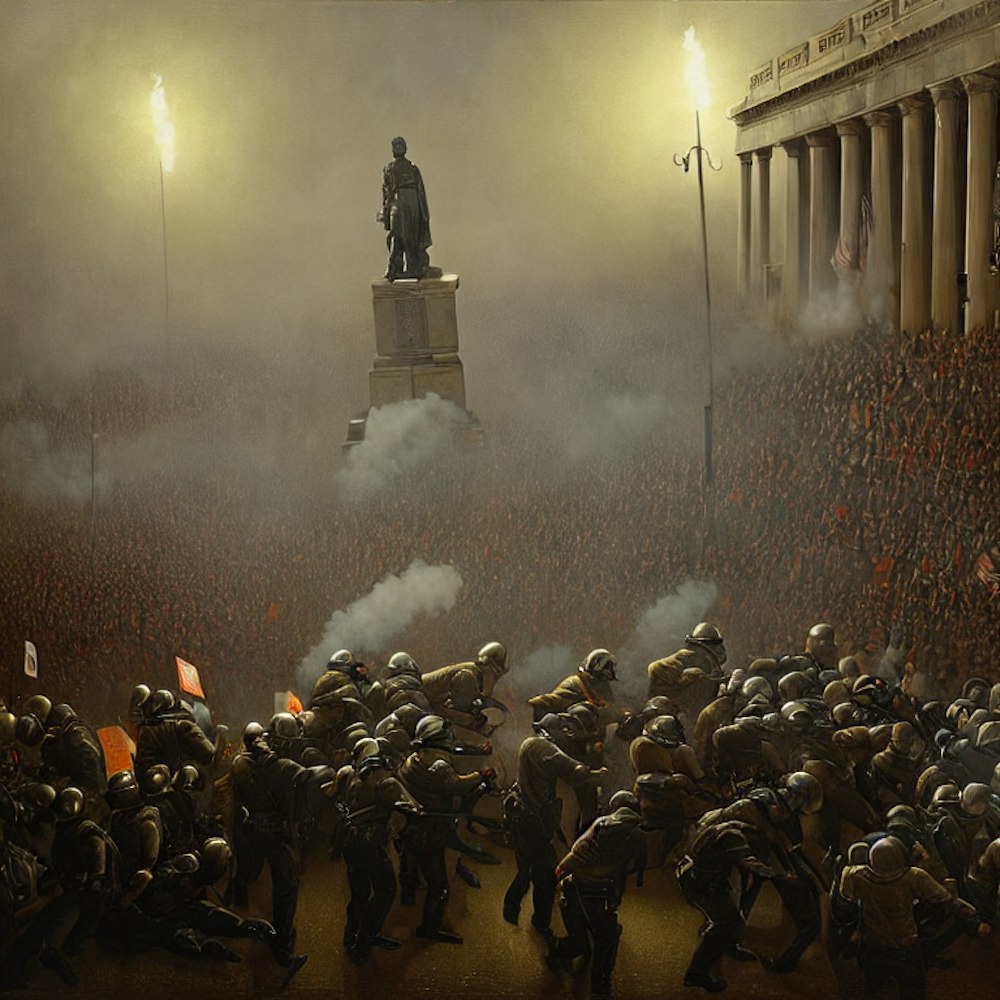 �Virginia state police officers shooting tear gas from armored personnel carriers with large loudspeakers into a crowd of protesters at the Robert E. Lee Monument in Richmond�