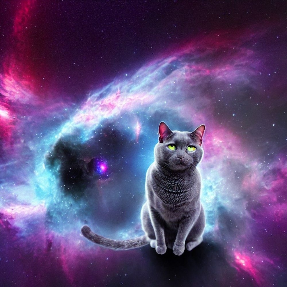 A single grey cat setting on a electronicr keyboard in space with a nebula in the background