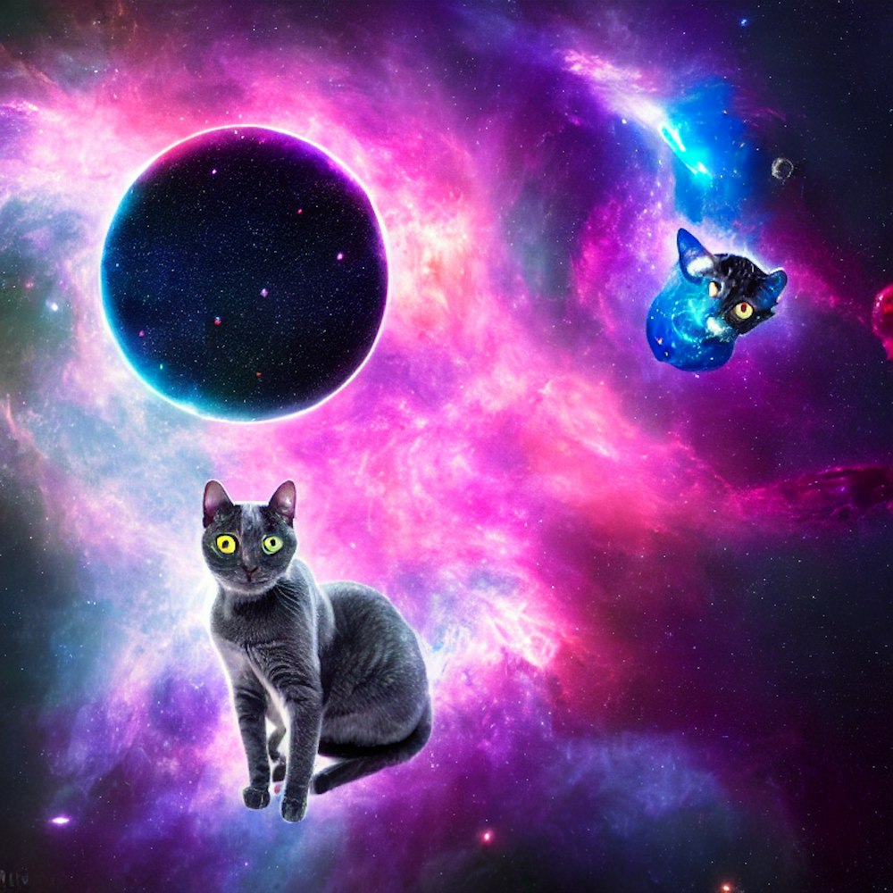 A single grey cat setting on a electronic keyboard in space with a nebula in the background