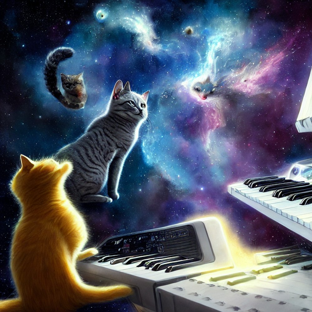 Electronic keyboard in space with Gray cat with Yellow eyes sitting on it and nebula in the background