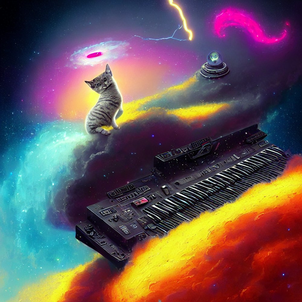 Electronic keyboard in space with Gray cat with Yellow eyes sitting on it and nebula in the background