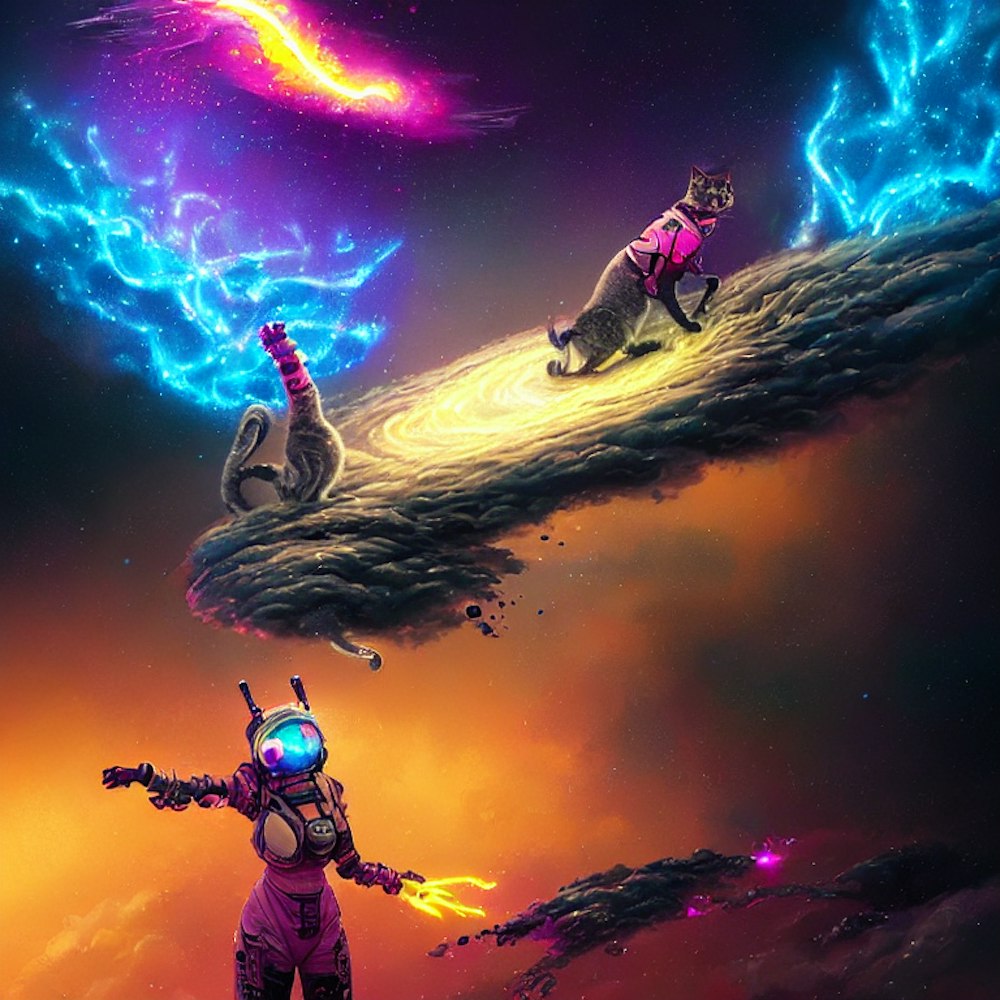 Electronic keyboard in space with Gray cat with Yellow eyes sitting on it and nebula in the background
