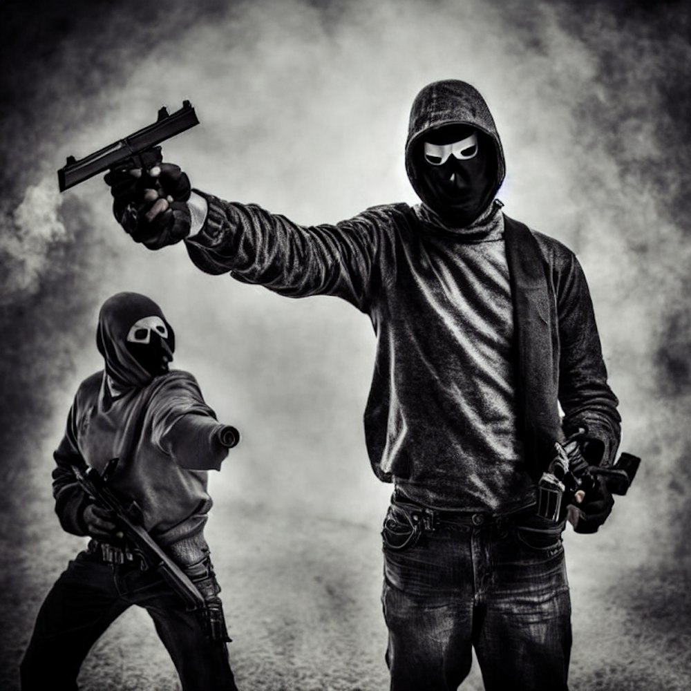 A masked man holding a pistol trying to shoot a man, an this pic is going to look like it was taken from a pair of meters away