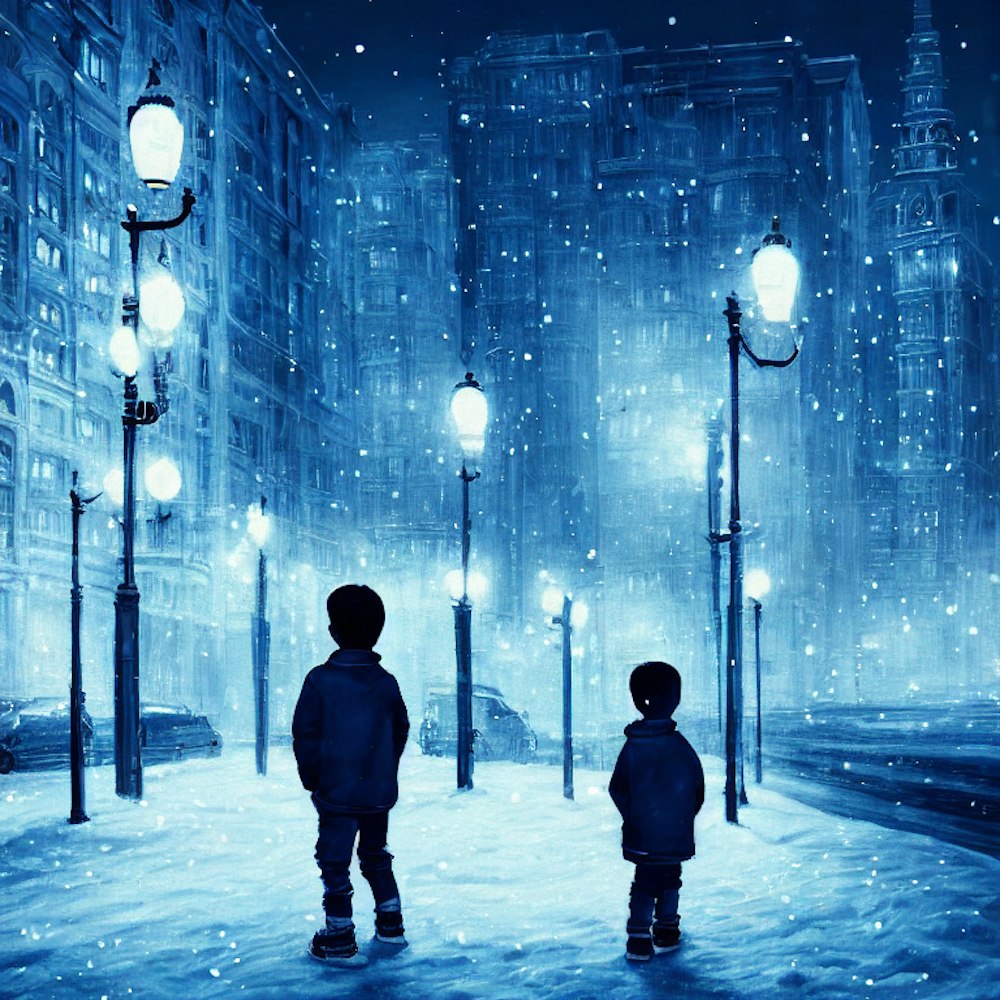 boy in the city at night, winter, white, blue colours.