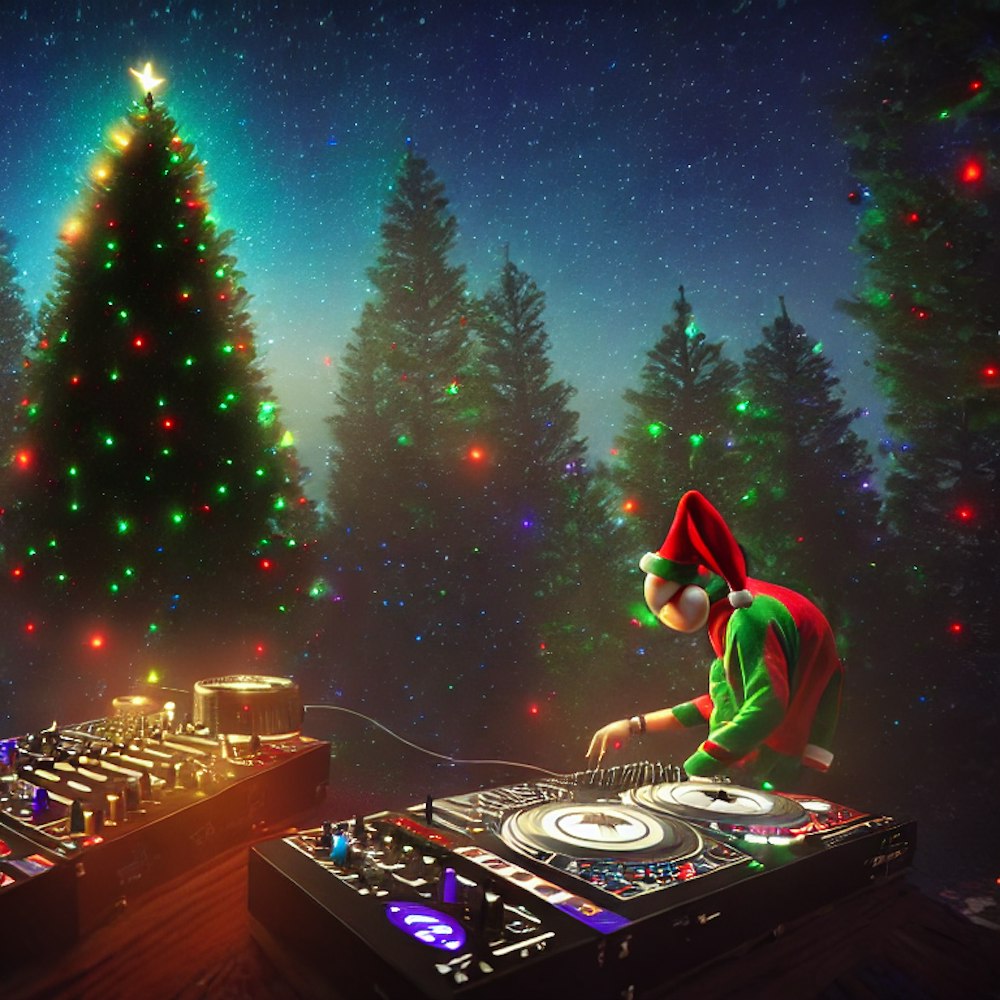 dj mixing lofi beats with christmas tree in the background