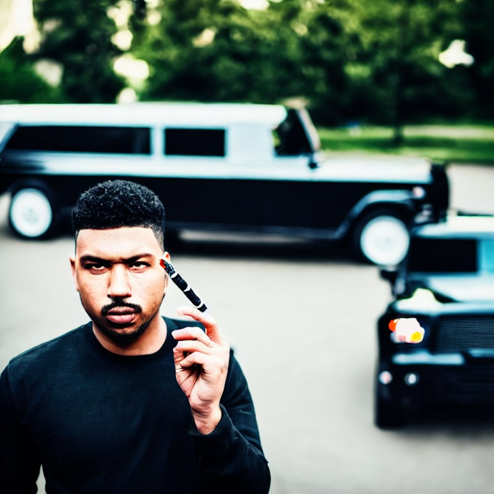 gangster, standing next to black suv, lighting a cig, HD QUALITY