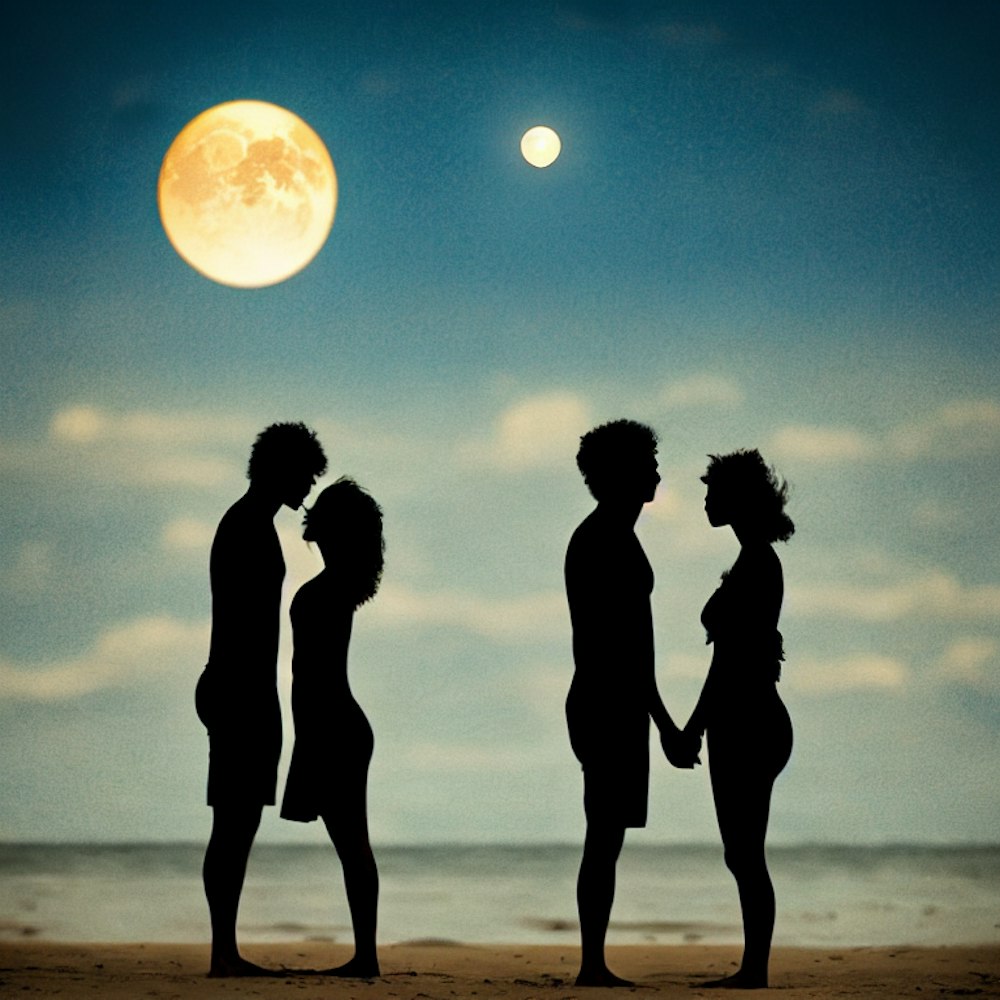 Silhouette couple at beach with 2 moons