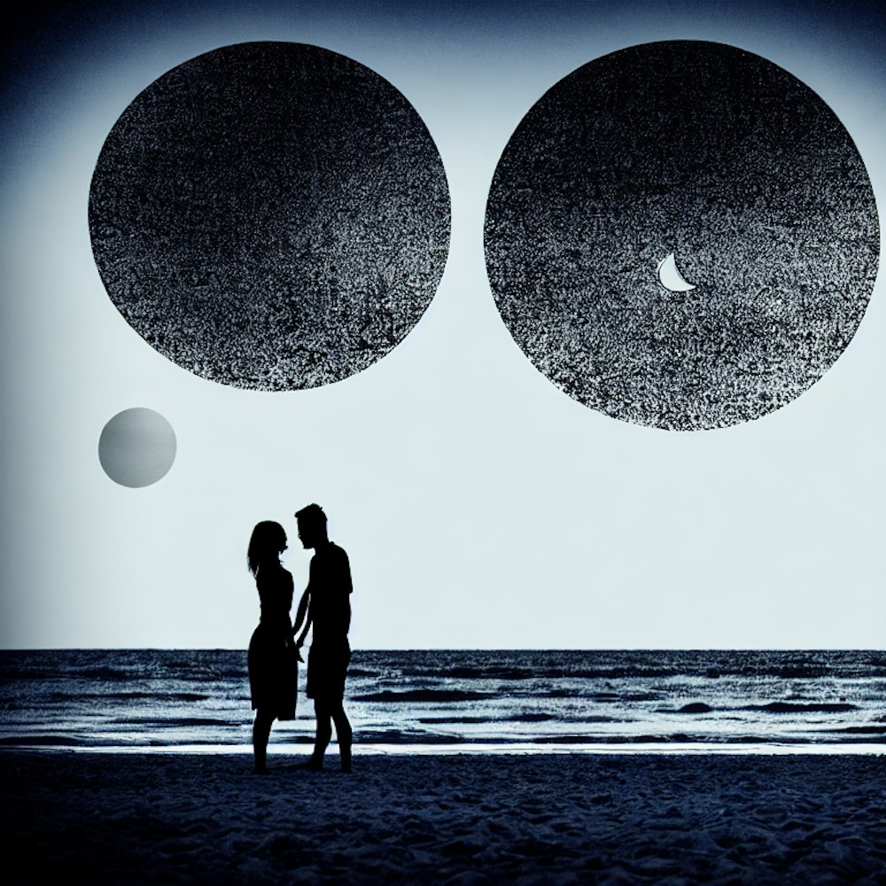 Silhouette couple at beach with 2 moons