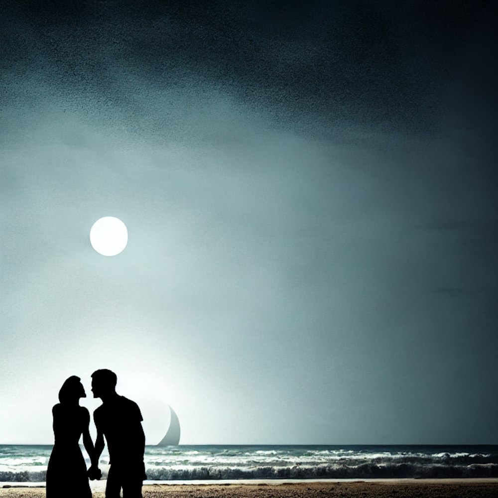 Silhouette couple holding hands at beach with 2 moons