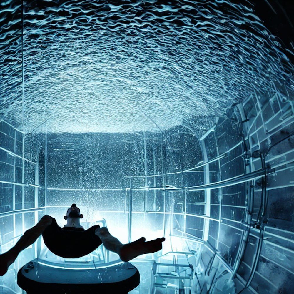 a man floating in a chamber full of water in a high tech laboratory