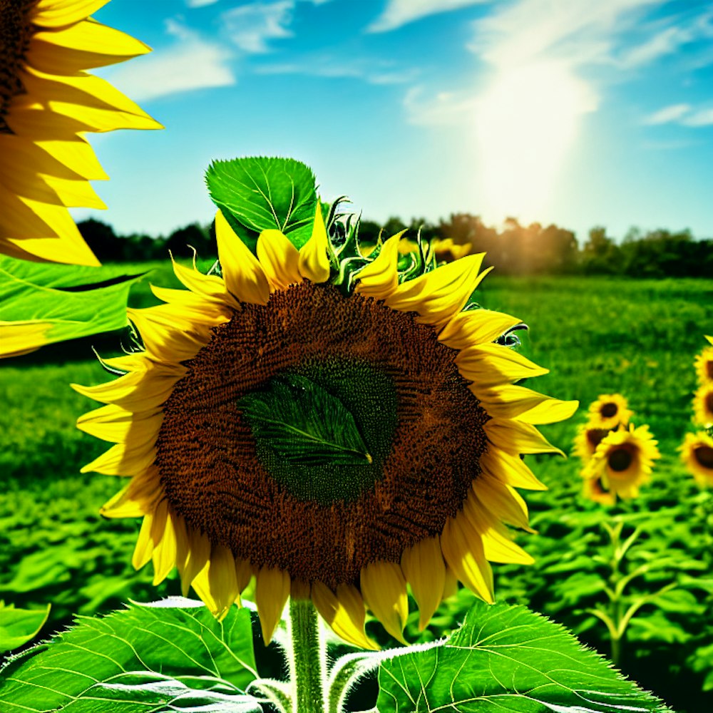 sunflower in a green pasture with blue sky