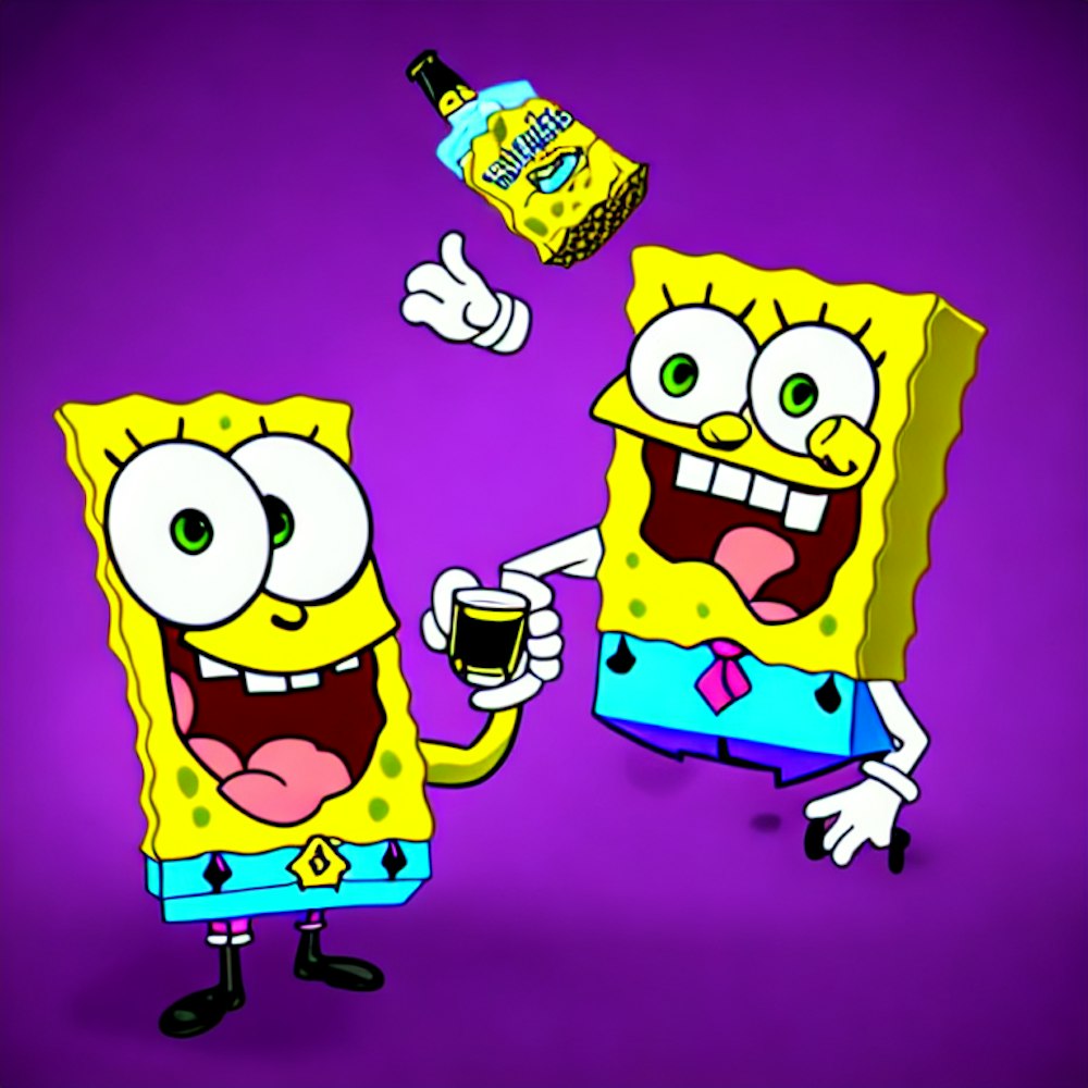 clean purple background, evil spongebob holding a beer