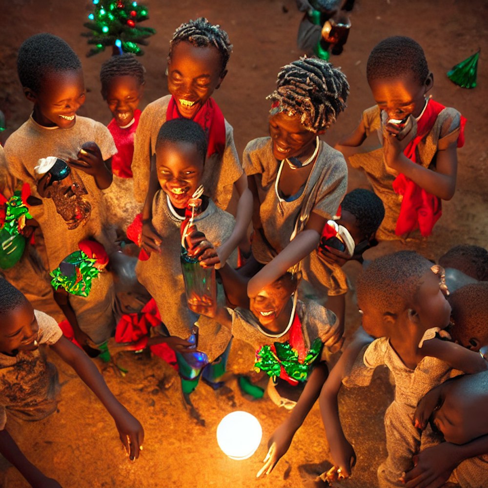 Christmas in africa black boys and girls happy and eating and drinking water and recieving gifts