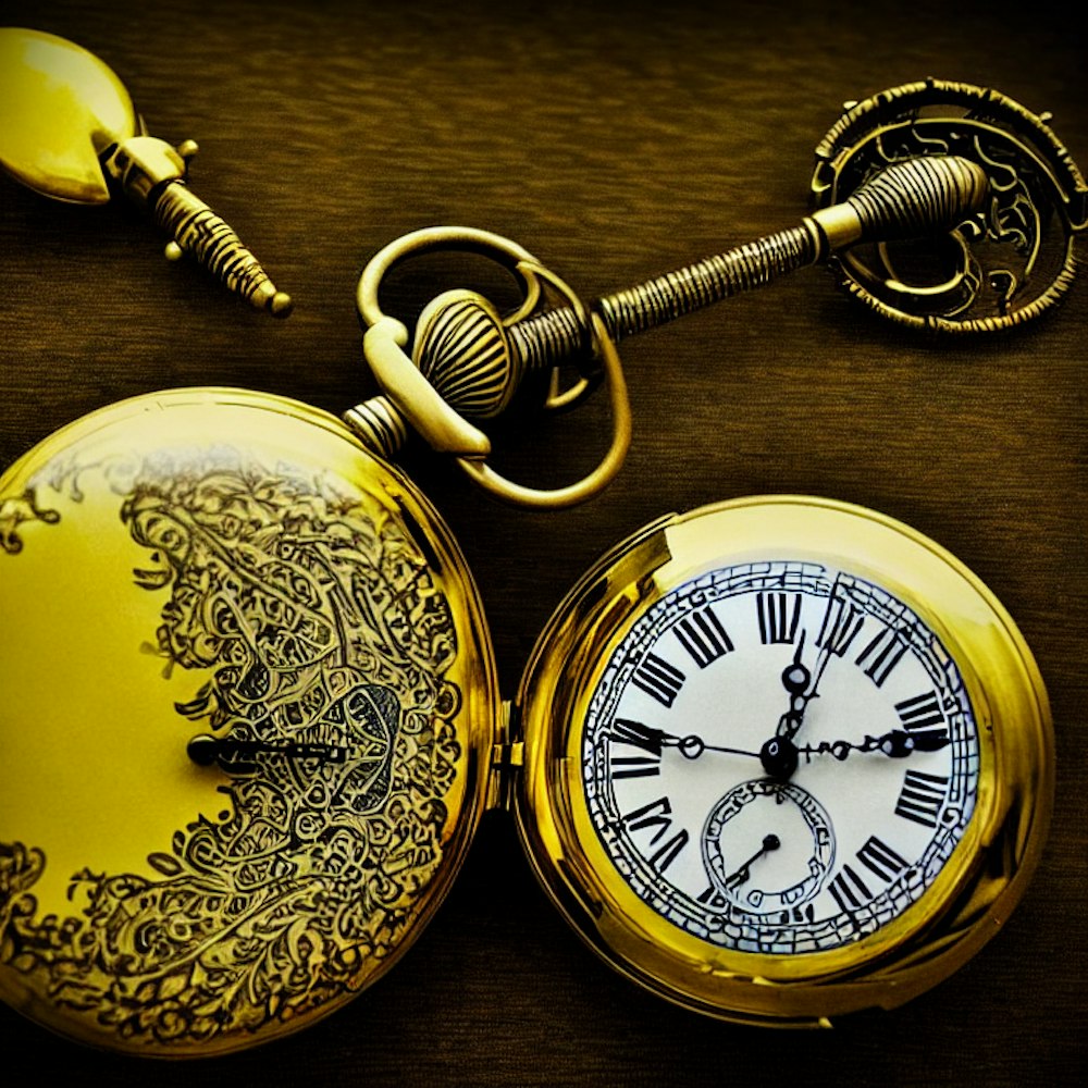 one pocket watch with a yellow dial, electric guitar in the background, gloomy scene with fog, very detailed