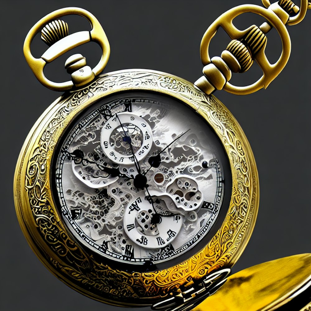 one pocket watch with a yellow dial, electric guitar, gloomy scene with fog, very detailed