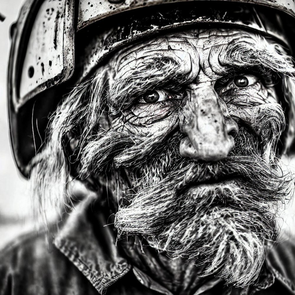 Create an image of an elderly male miner with deep wrinkles and a rugged, weathered face covered in soot. He should have intense, piercing blue eyes and a grey, unkempt beard. His expression conveys years of hard work and determination. The man is wearing a miner�s helmet, suggesting his profession, and the lighting casts dramatic shadows across his features, highlighting the texture of his skin and the fatigue in his eyes. The background should be dark to emphasize the subject.