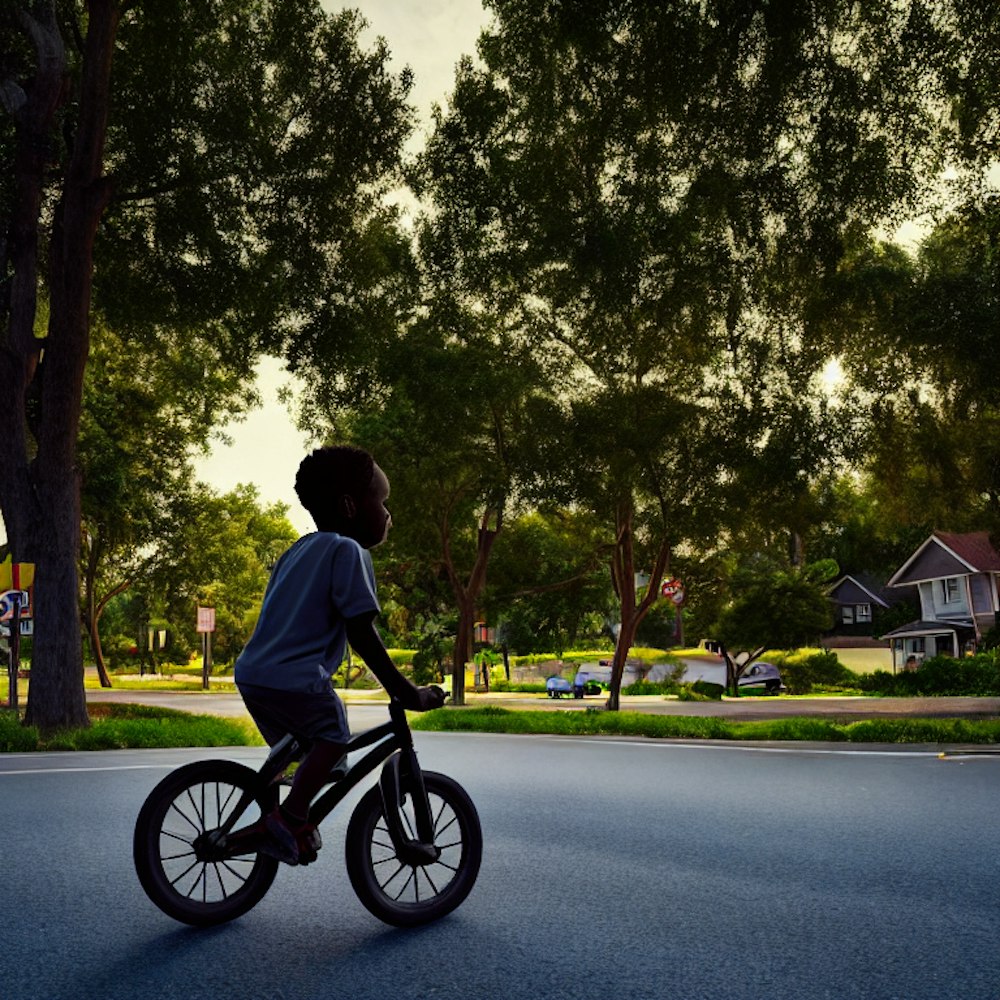 a black child riding a bike in an American neighbourhood with trees and a large road
