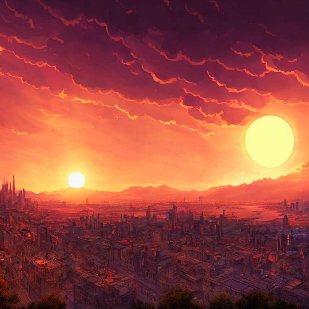 beautiful cartoon sunset facing the city