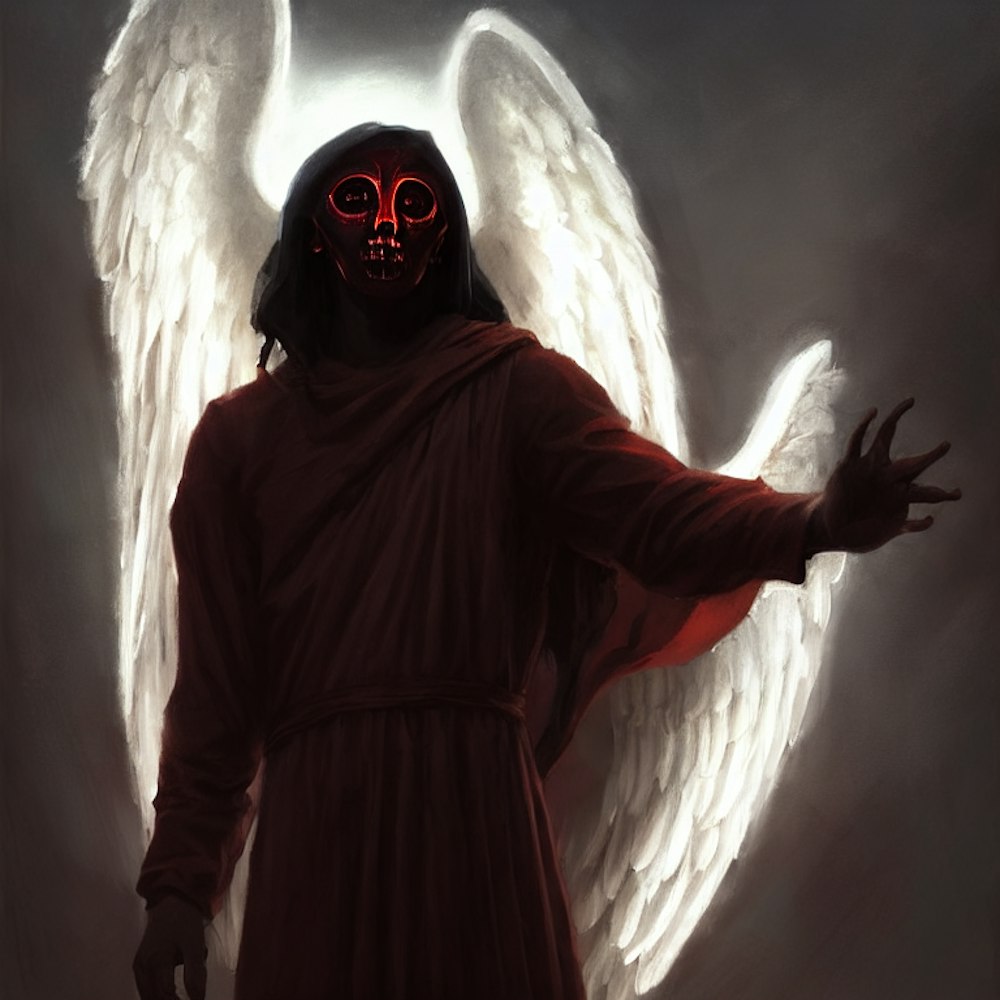 a painting of an angel with a halo, scp-914, demon noble character design, with blackness instead of eyes, red and brown color scheme, color study, post - apokalyptic, ( ( ( horror art ) ) )