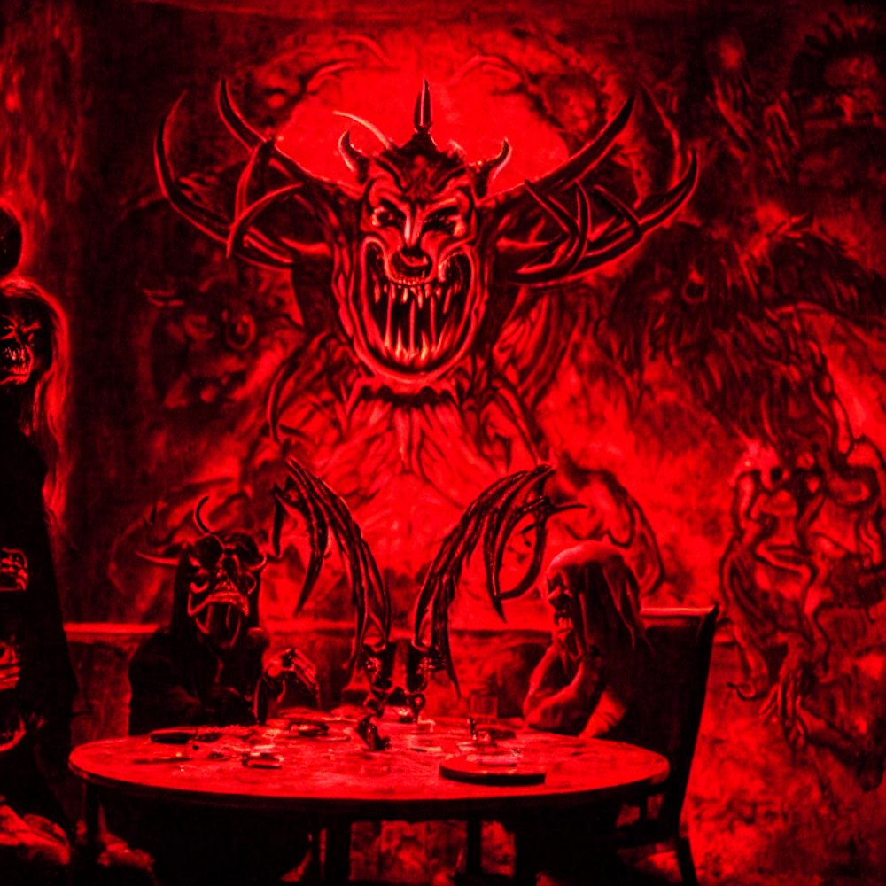 two demons sitting around a table, atmospheric red lighting, final judgement, real picture, bar, exploited, red on black and yellow, tool band, standing in hell, the endless, 666, red banners