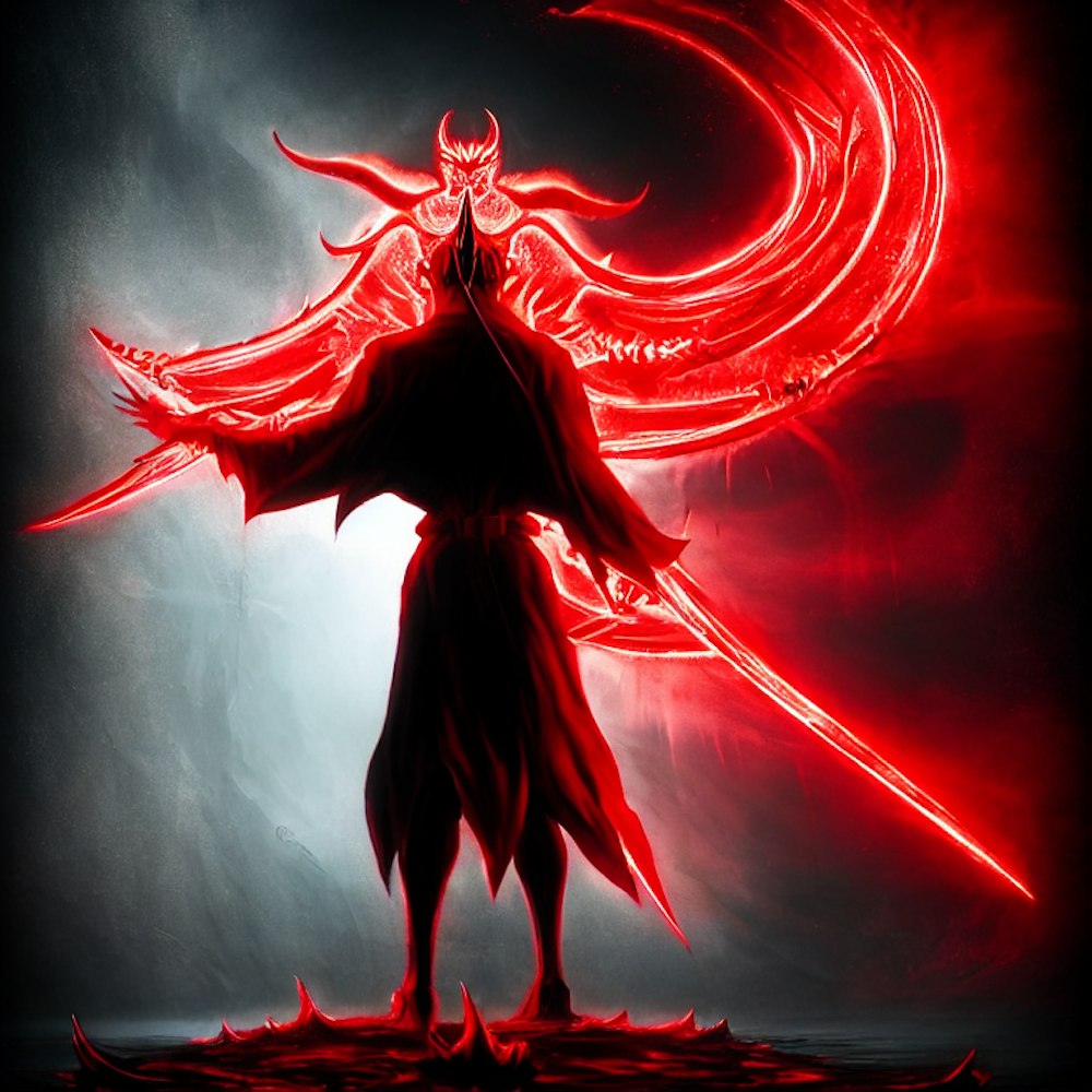 a person standing in front of a red light, demon noble character design, no watermark signature, banshee, symbol, canvas print, empire silhouette, removed watermarks, from overlord, inspired by Shūbun Tenshō, standing in hell, surrender, dd, of lucifer, ad image