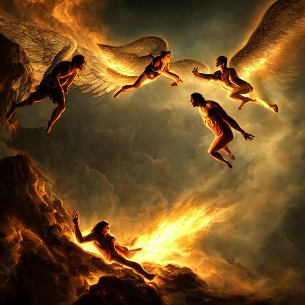 person falling to hell and an angel trying to save him