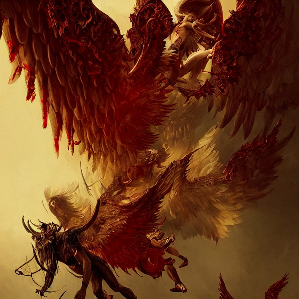 masculine demon and angel falling , tunic, wings, yellow in black in red, hell and heaven