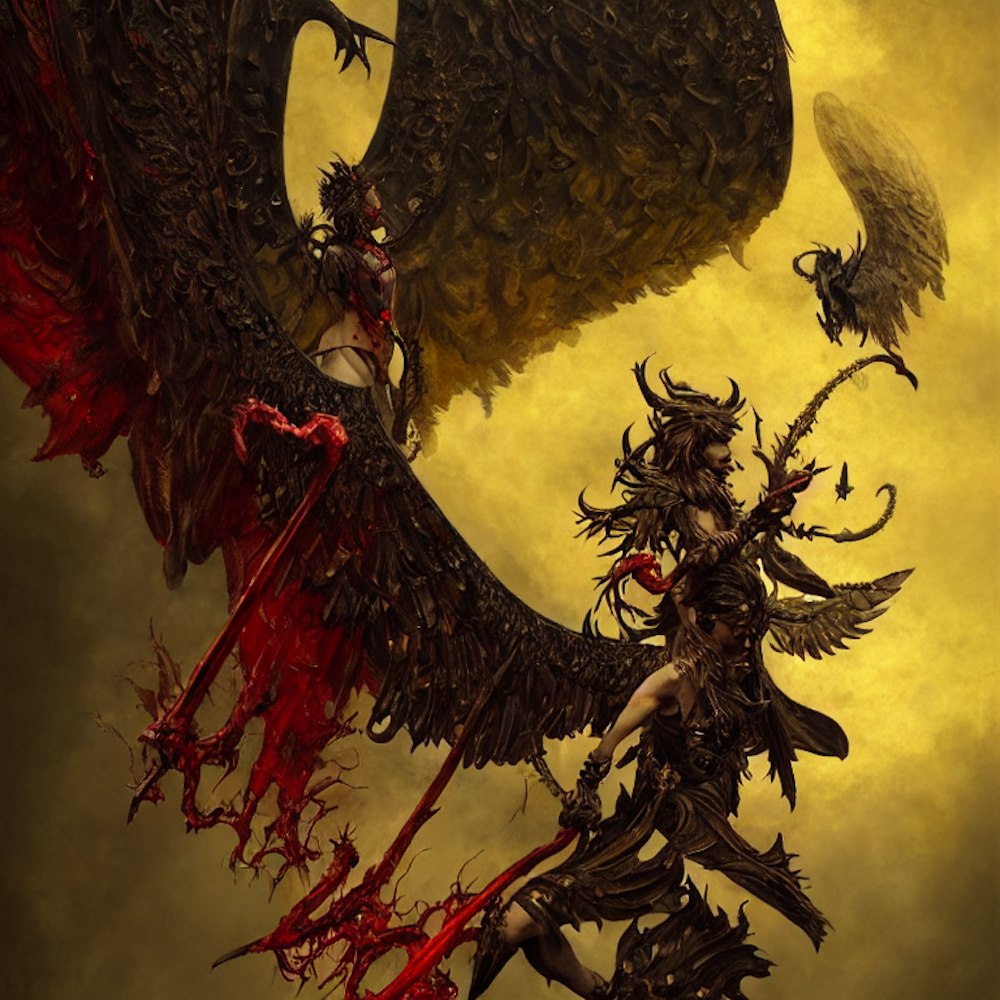 masculine demon and angel falling , tunic, wings, yellow in black in red, hell and heaven