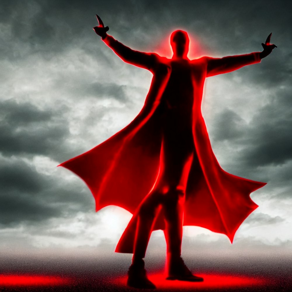 Create an image of a demon noble character standing in front of a red light. The character should be surrendering to the viewer, with their hands raised in a gesture of submission. The image should be set in a hellish landscape, with an empire silhouette in the background. The character should be wearing a black suit and a red cape, and their face should be obscured by a hood.