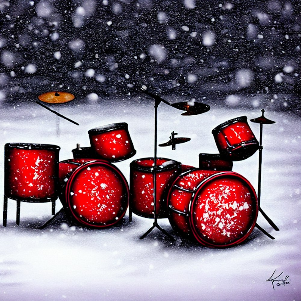 Red drumset rotting away in the snow storm