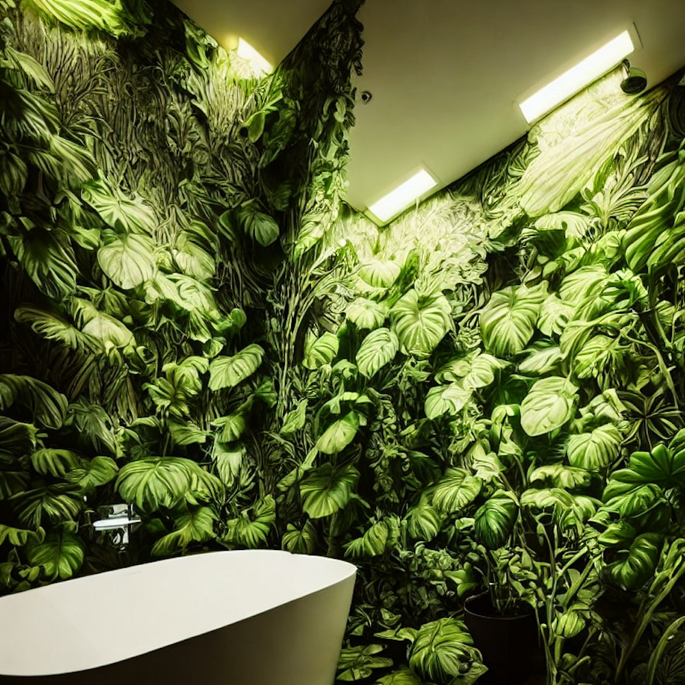 plants overtaking bathroom