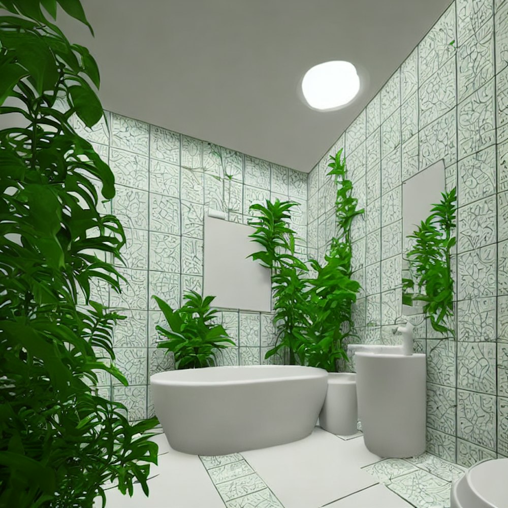 plants overtaking bathroom, realistic, white tile