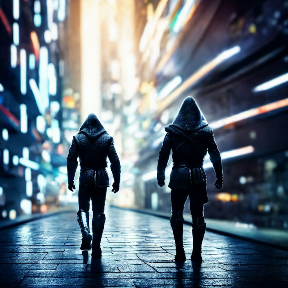 altair from assassisns creed walking through a modern bladerunner city
