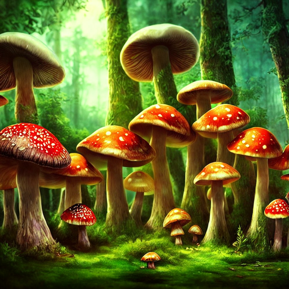 Colorful giant mushrooms forest