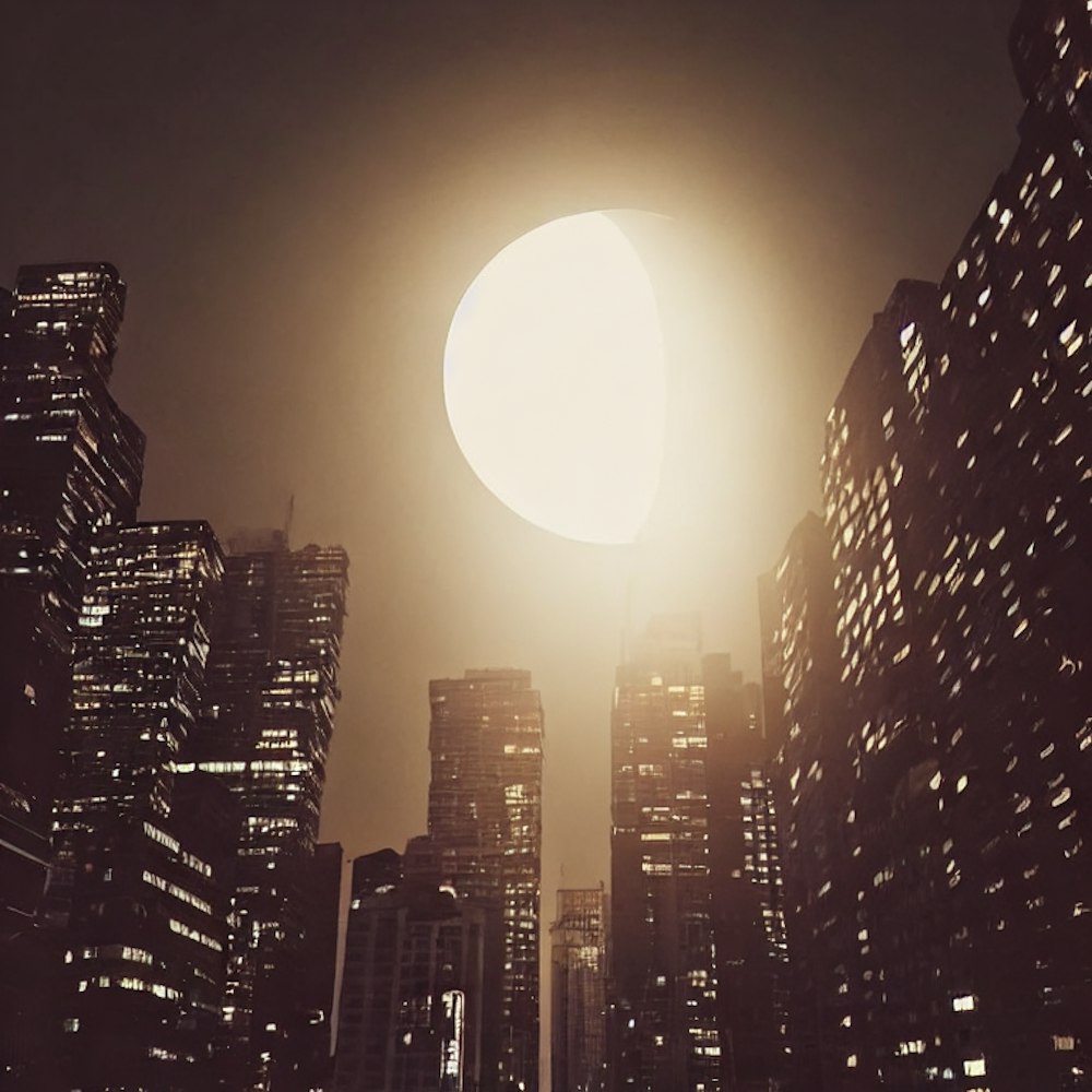 night time, guy in the city looking up to the moon, but the moon is an eye instead