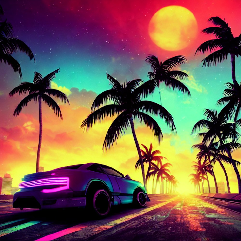 1 cyberpunk car on the beach road, gradient sunset, green burning city skyline, palm trees, Lisa frank style, dark tones, realistic details