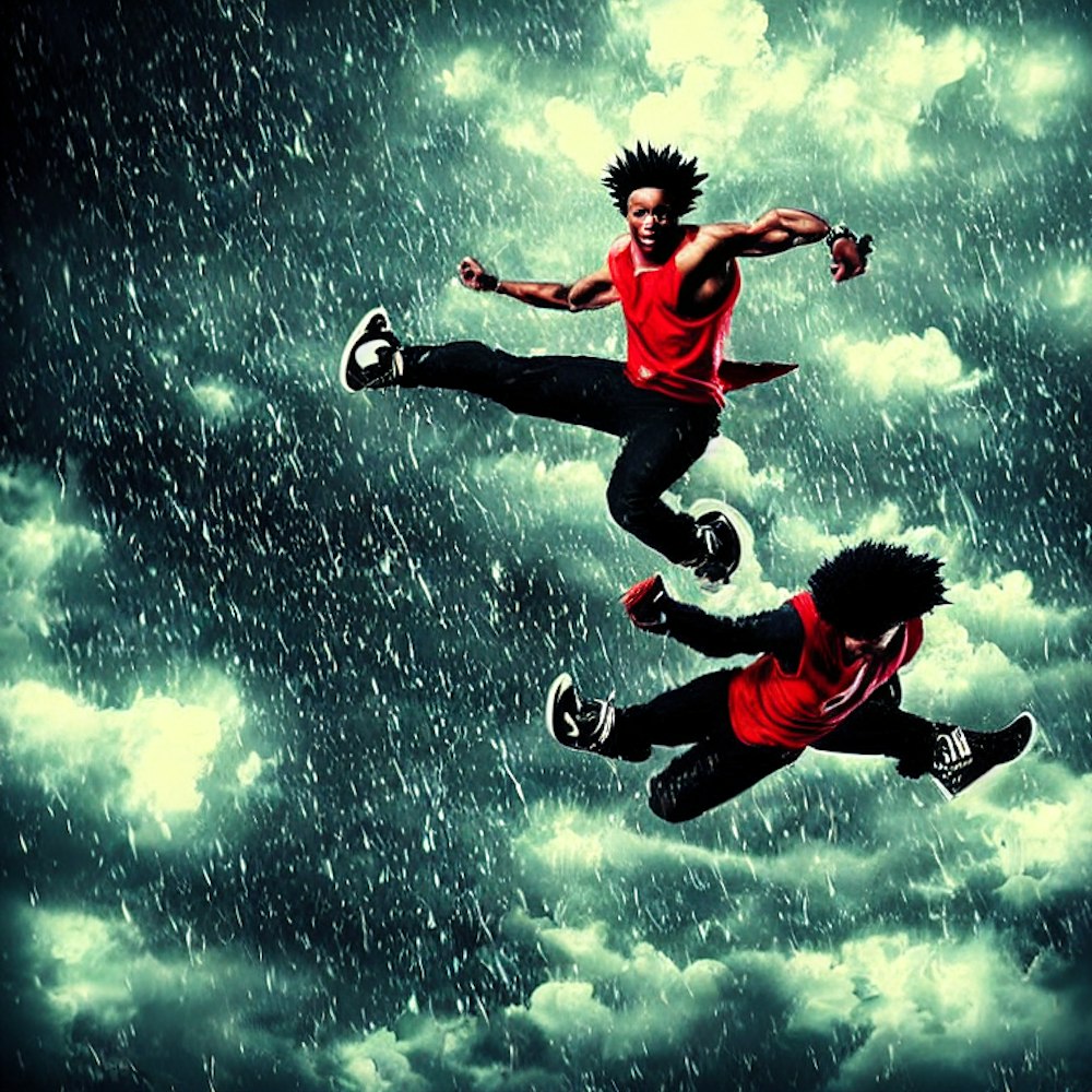 black supersayian Chuck Stickem flying through raining money