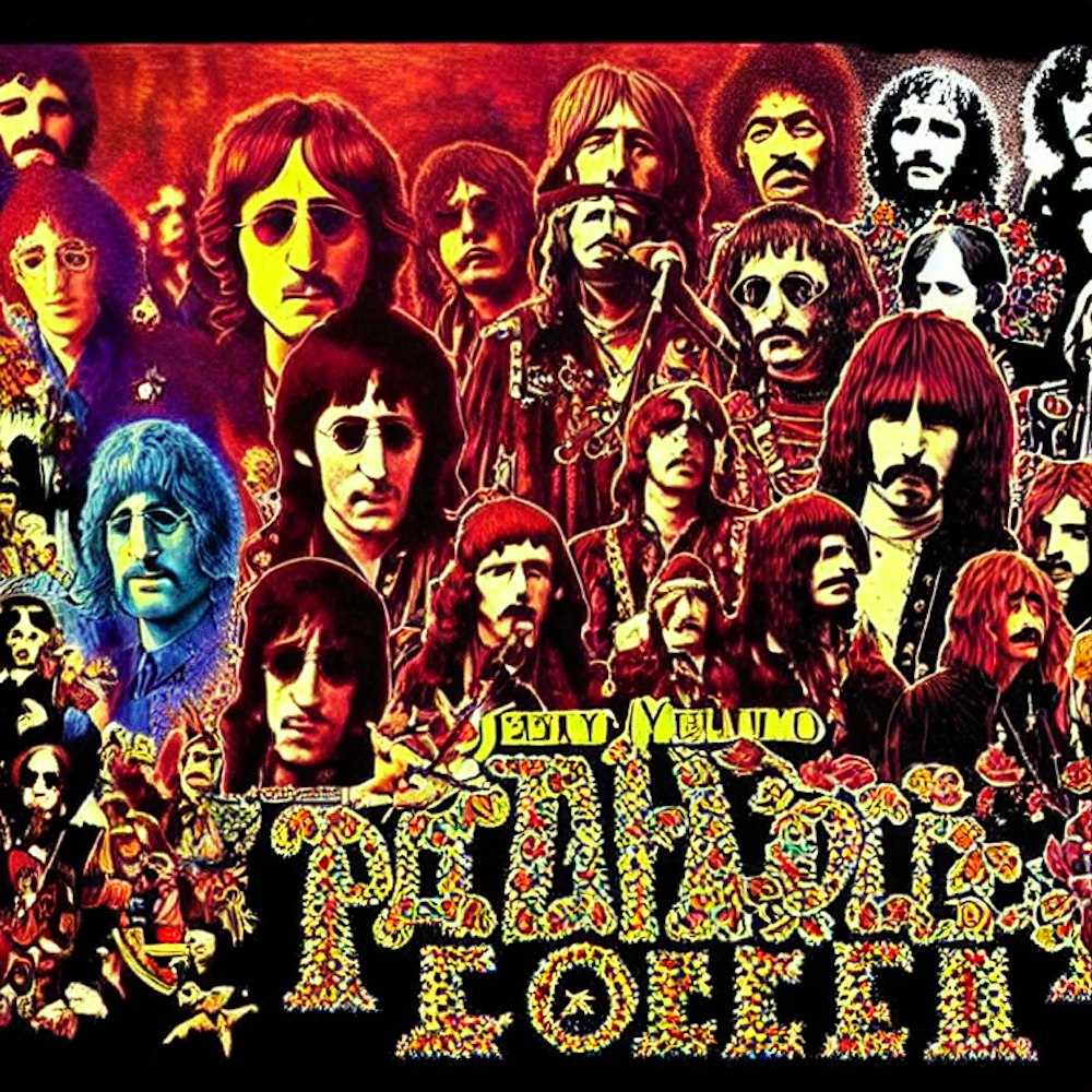 real picture in the style of sgt. peppers with john lennon , jim morrison, jimi hendrix , kurt cobain , layne stayley ,�