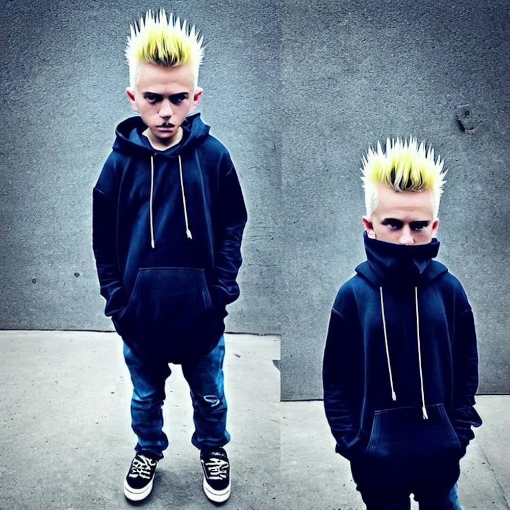 a mini me with blonde spiky hair, a baggy black hoodie with the hood up, a blue pair of jeans, and sneakers. he has headphones around his neck