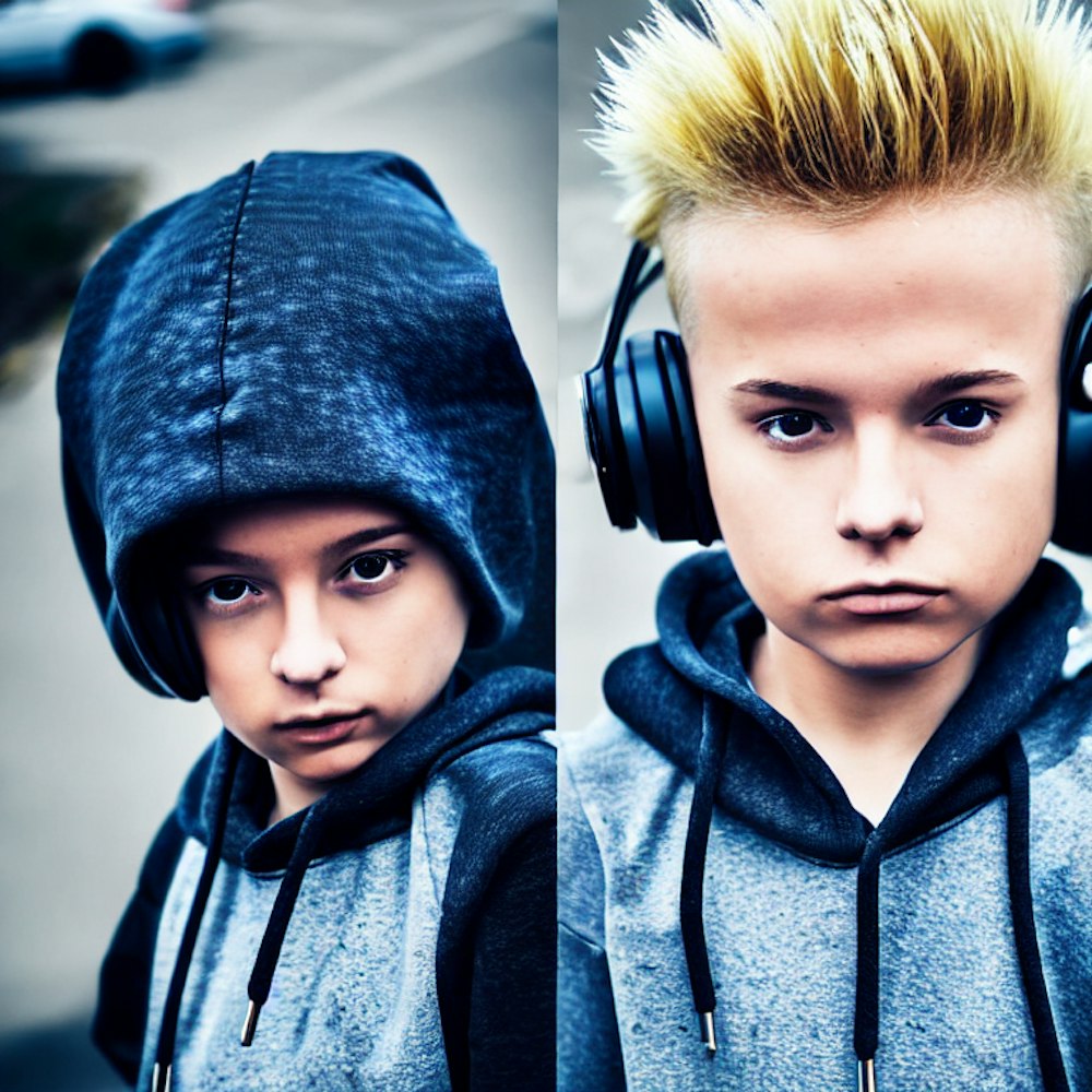 a mini me with blonde spiky hair, a baggy black hoodie with the hood up, a blue pair of jeans, and sneakers. he has headphones around his neck