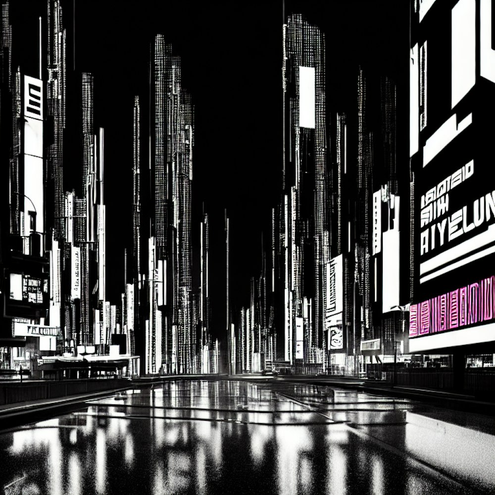 cyberpunk cityscape with high skyscrapers in black and white taken from below, deserted streets with pedestrian crossings made with orange neons, road stripes made with yellow neons, rain, puddles, in the center of the image a large rectangular advertising billboard with the numbers 2359 made of red neon lights