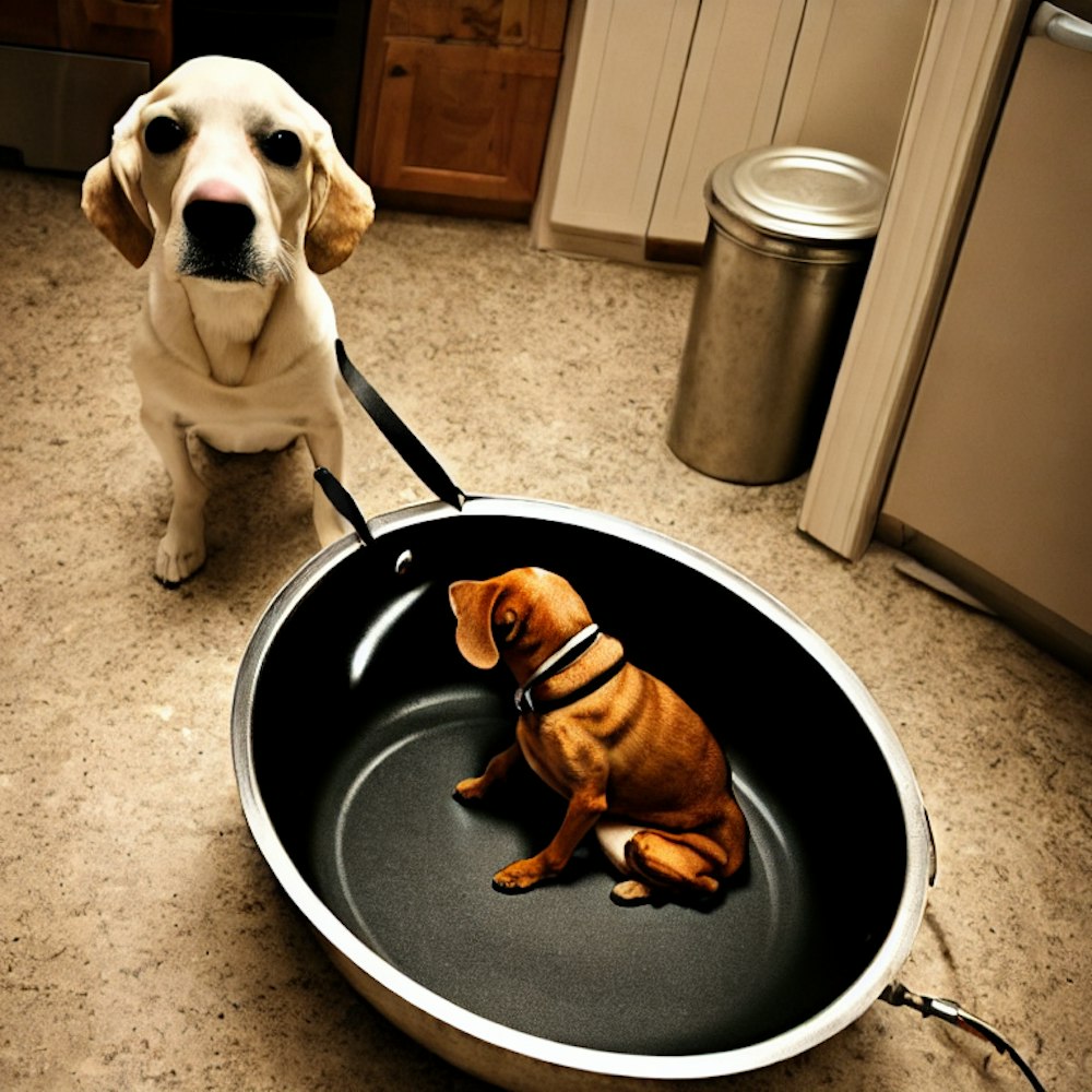 dog sitting in a pan