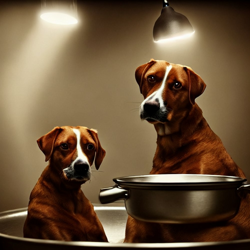 a dog sitting in a pan