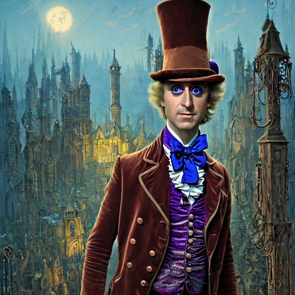 Willy Wonka serial killer cartoon, up close, portrait, realistic, 8k, photo