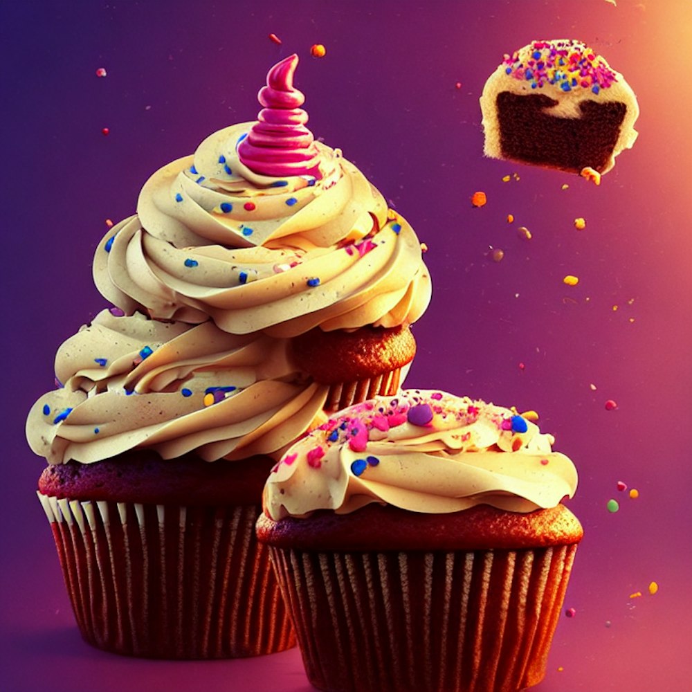 A cupcake eating a smaller cupcake, graphic, up close, whimsical, bright colors, portrait, realistic, 8k, photo