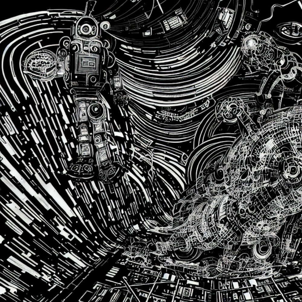 Black and white trippy lines cosmos with a robot hand that says evolve and add a dystopian to it make it very cyberpunk style too