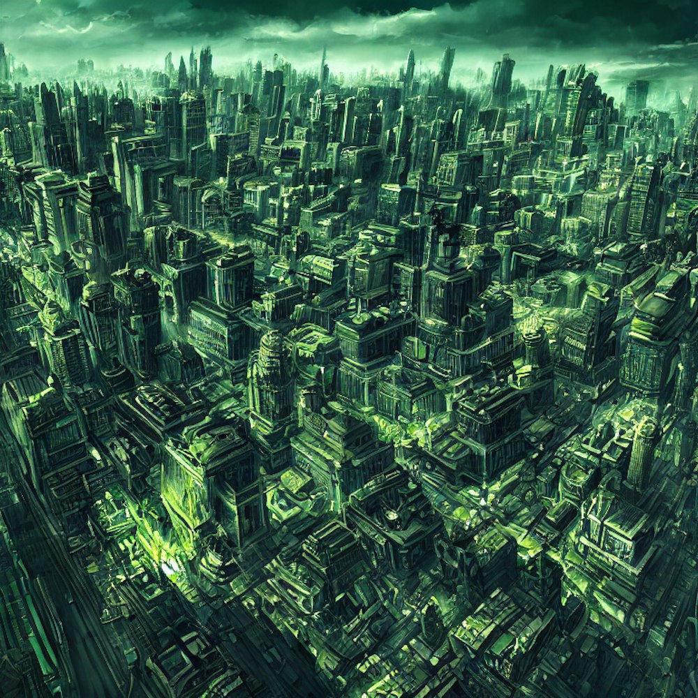 Green skies over a city