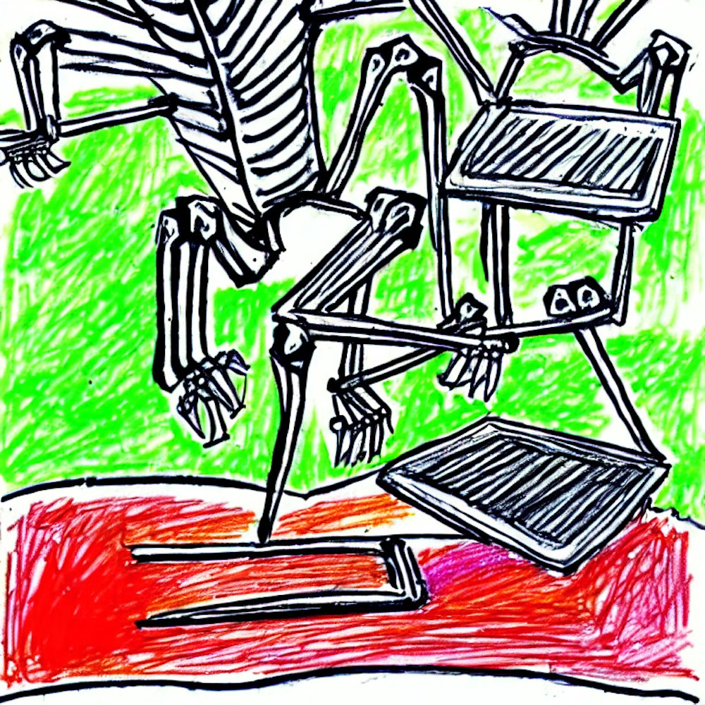 Cartoonish skeleton grilling on the patio, sunny day, simple drawing, not highly detailed, bright colors